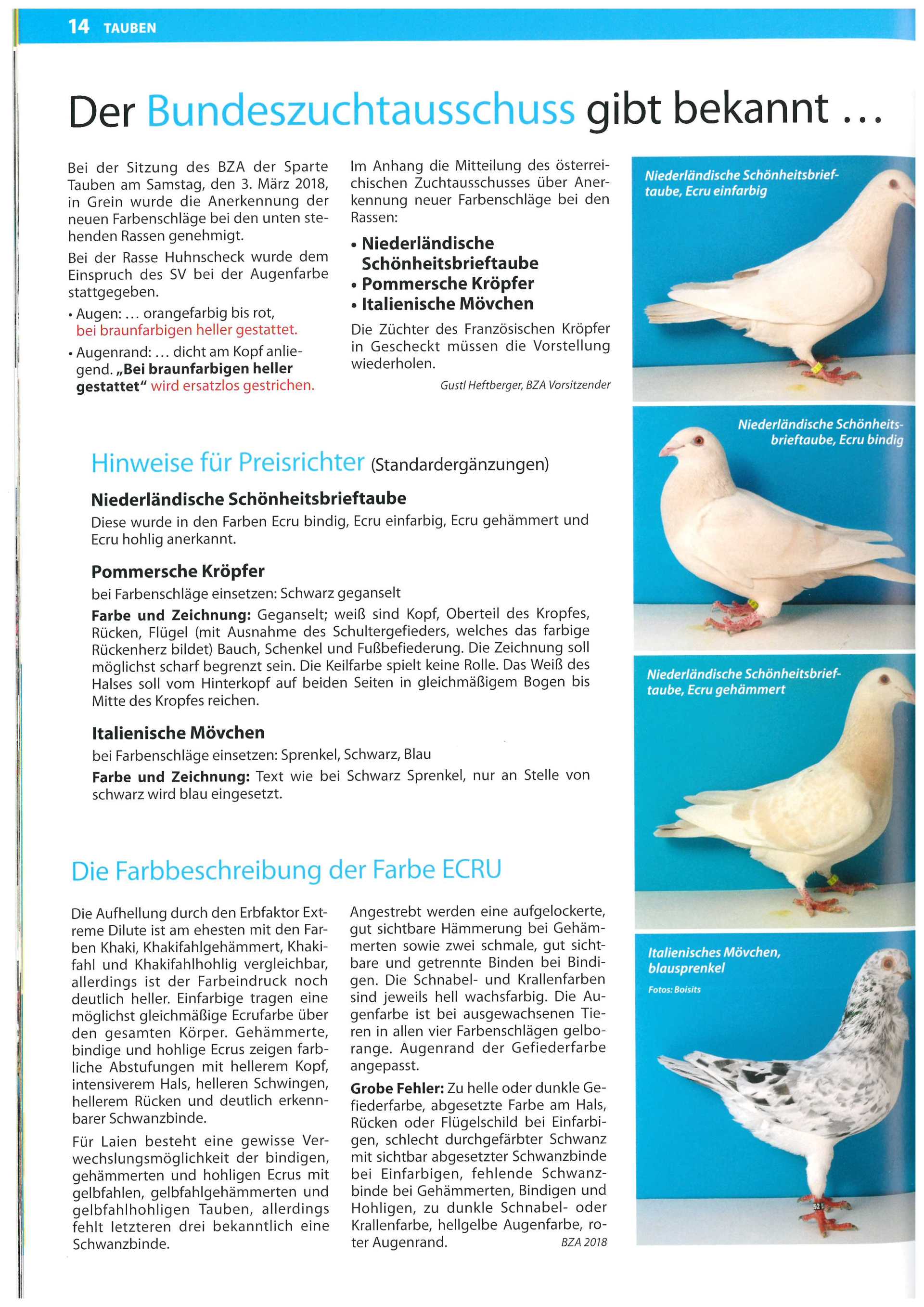 Die Rückpaarung von einem blaubindigen Täuber, mischerbig für Ecru x einer der Ausgangstäubinnen in Ecru gehämmert erbrachten zur Hälfte Ercu-Jungtiere worunter zwei Ecru-Jungtäuber waren. Diese beiden Jungtäuber sind absolut vital und zeigen keinerlei Einschränkungen.